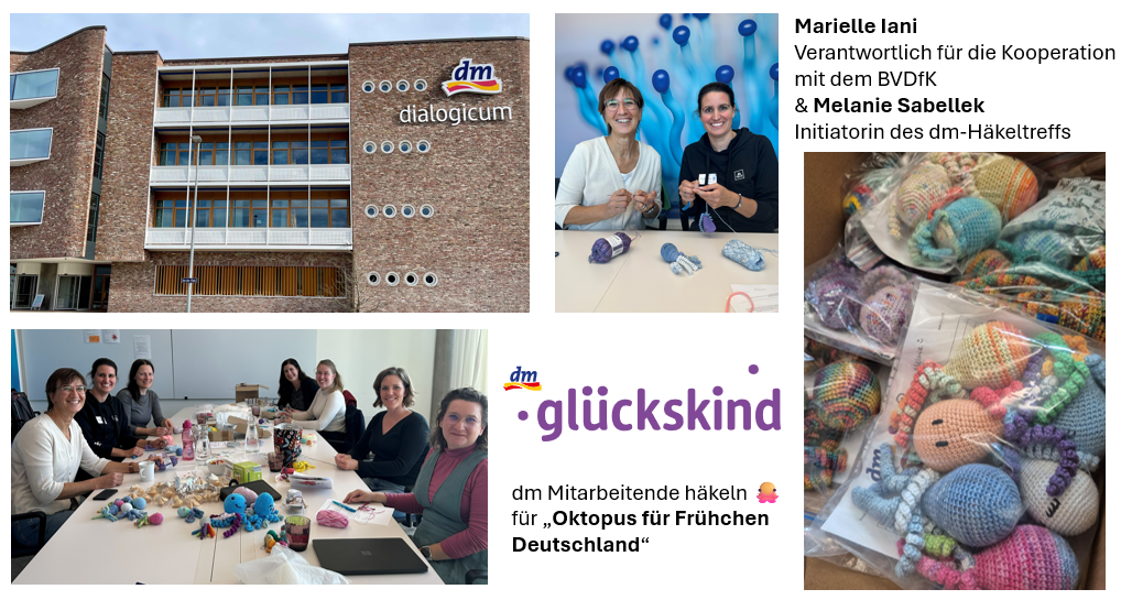 Im dm-dialogicum (dm-Unternehmenssitz in Karlsruhe) sind seit Oktober bereits 20 Kolleginnen mit viel Engagement dabei, kleine Tintenfische für die tapferen Kämpfer zu häkeln.