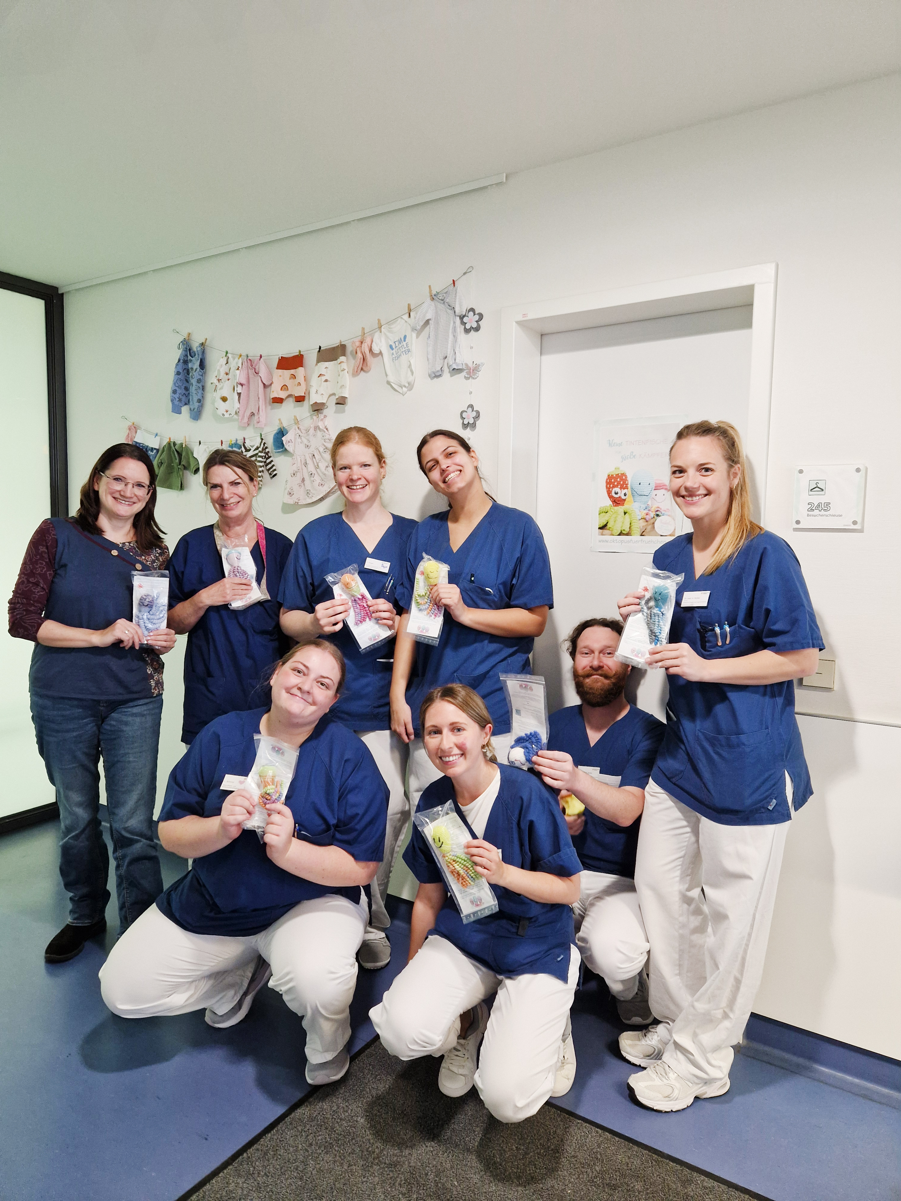 Bereits Ende Oktober durfte ich im Klinikverbund Südwest Böblingen-Sindelfingen eine große Okti-Lieferung persönlich überreichen. Neben 20 lilafarbenen Oktis für den Weltfrühchentag kamen 50 weitere bunt gemischte Exemplare sowie ein Stationsokti dazu.