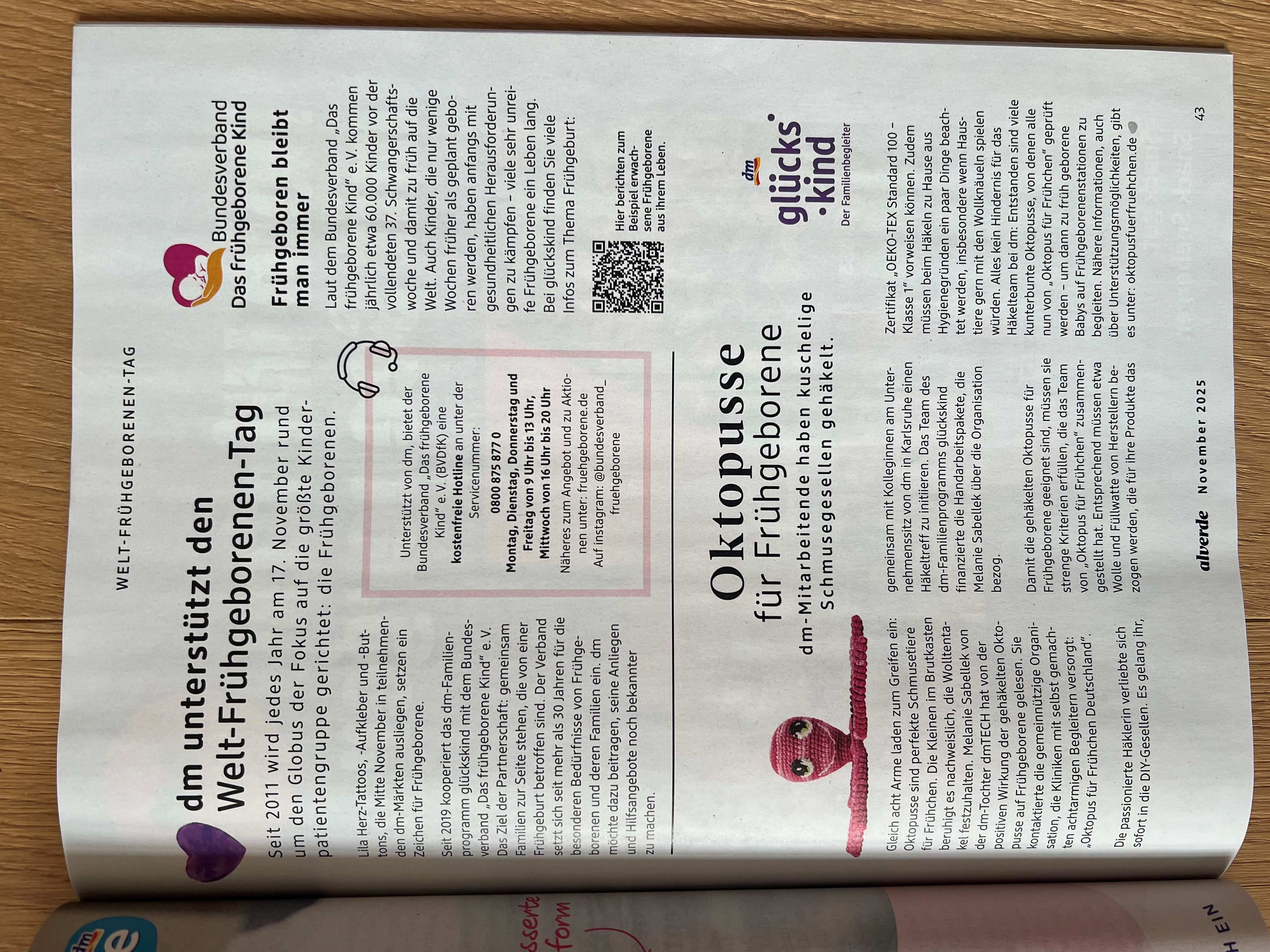 Wir sind überglücklich – Oktopus für Frühchen Deutschland ist in der aktuellen alverde, dem Magazin von dm, zu finden.